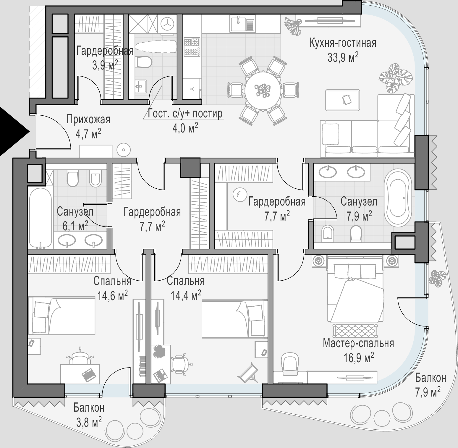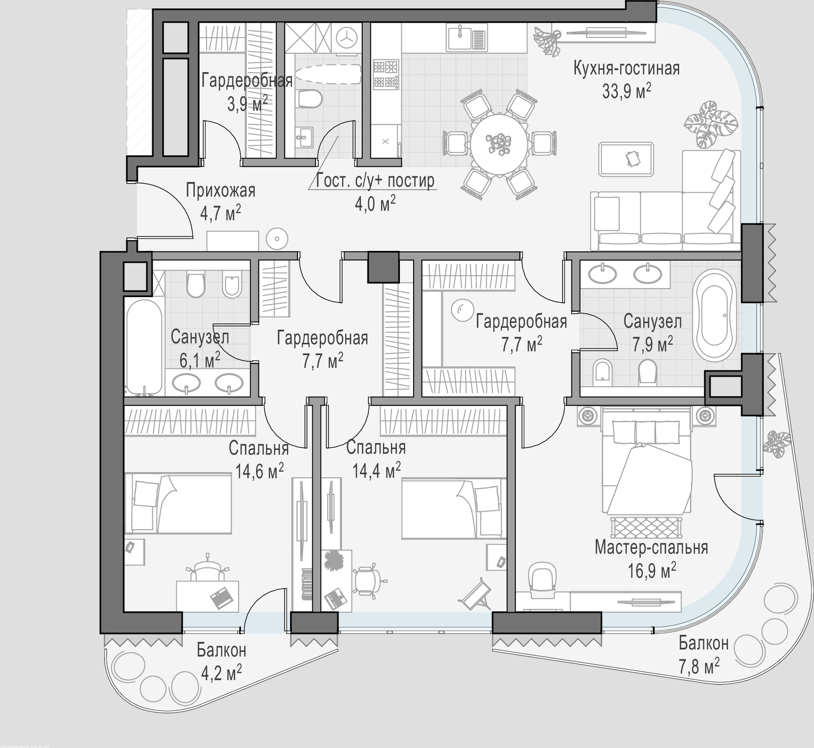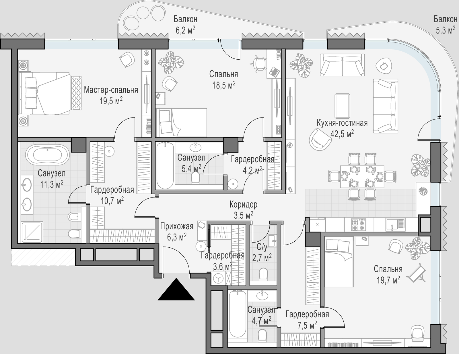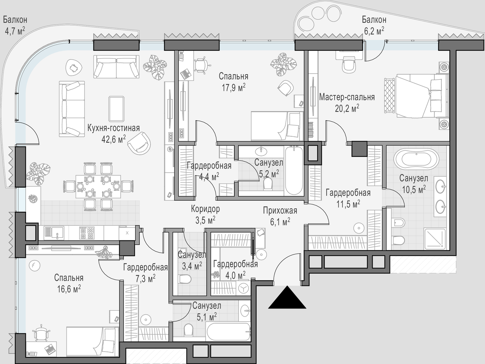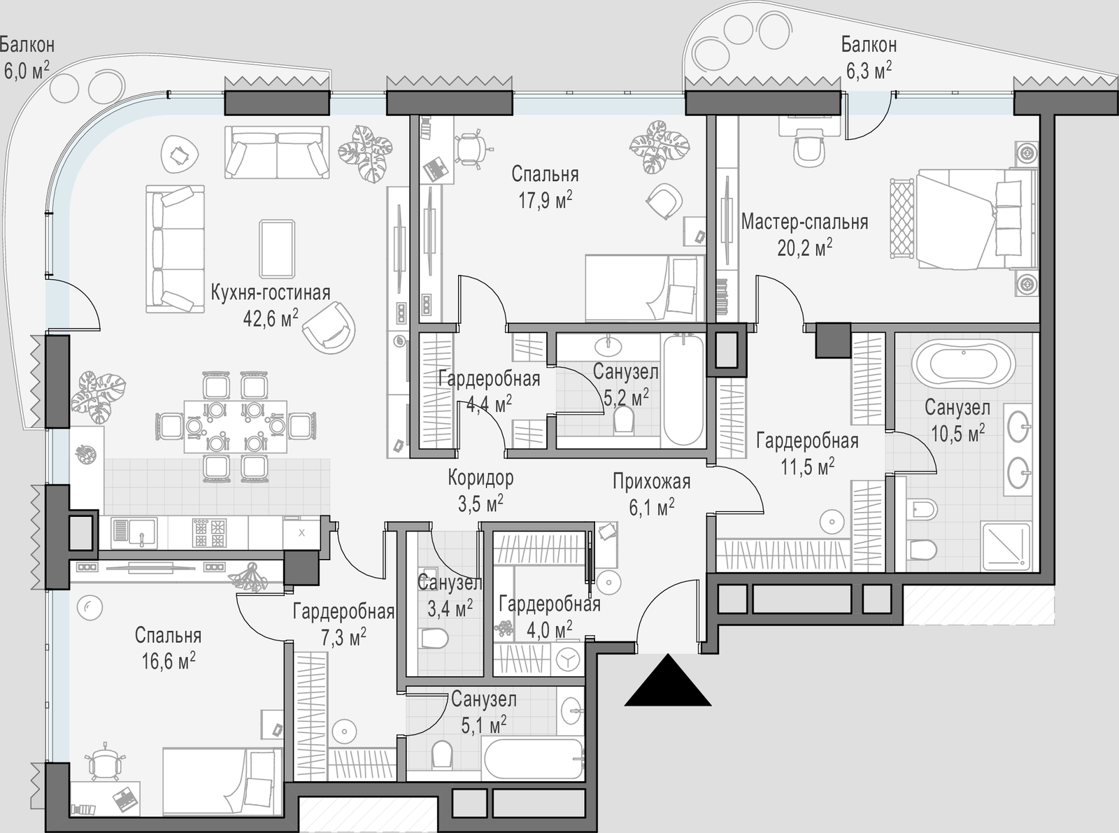 • Просторные балконы и террасы в большинстве квартир.