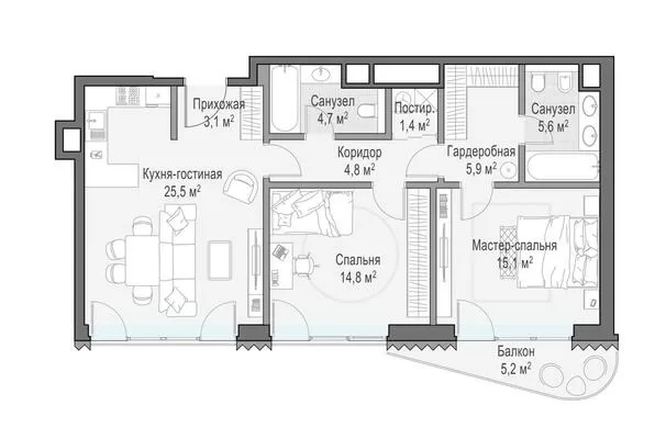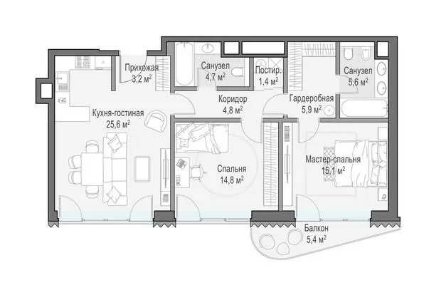 85.9 м² · 2 комнаты · 8/14 этаж · Объект сдан