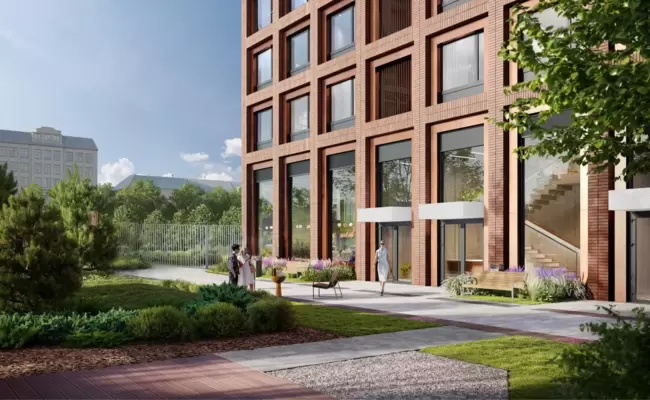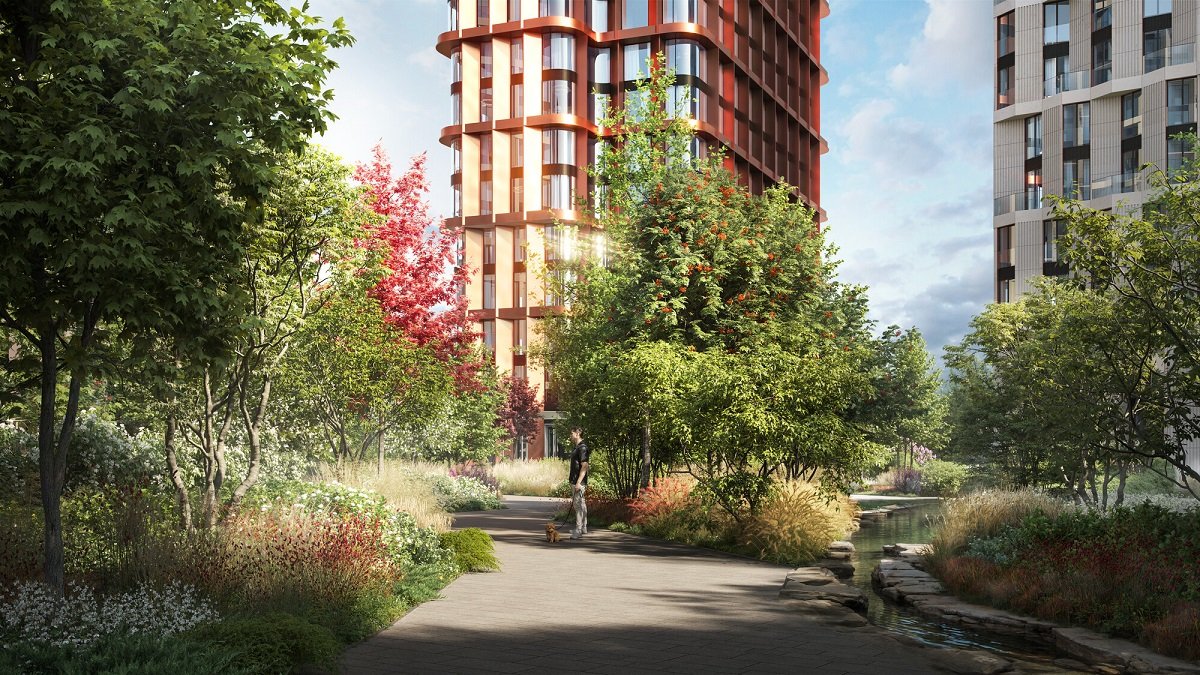 В парке созданы крытые галереи и приватные зелёные комнаты для тихого отдыха в любую погоду. Насыщенное озеленение многолетними растениями с разными периодами цветения сохраняет территорию квартала красивой круглый год.