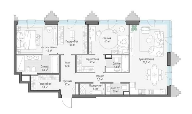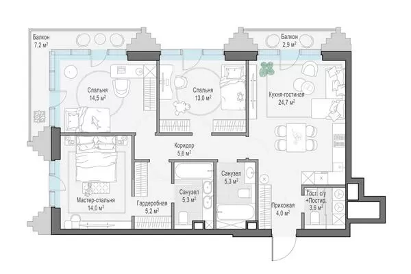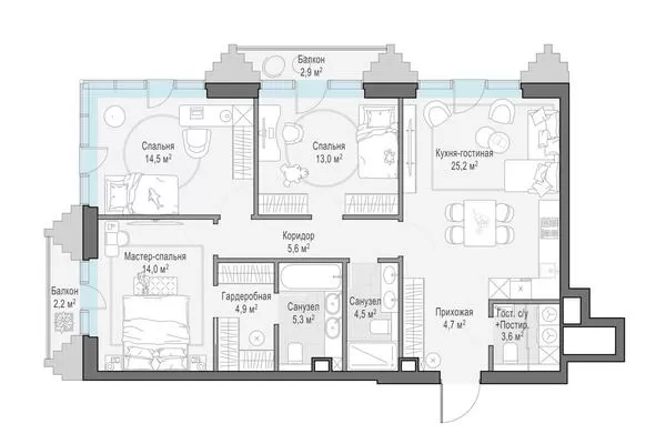 96.7 м² · 3 комнаты · 4/14 этаж · Сентябрь 2027
