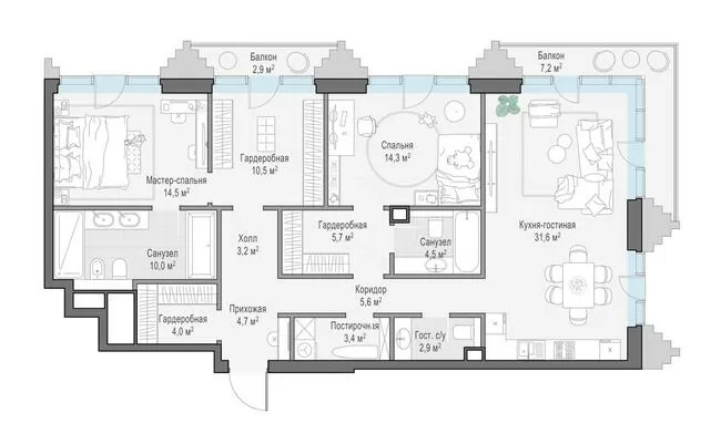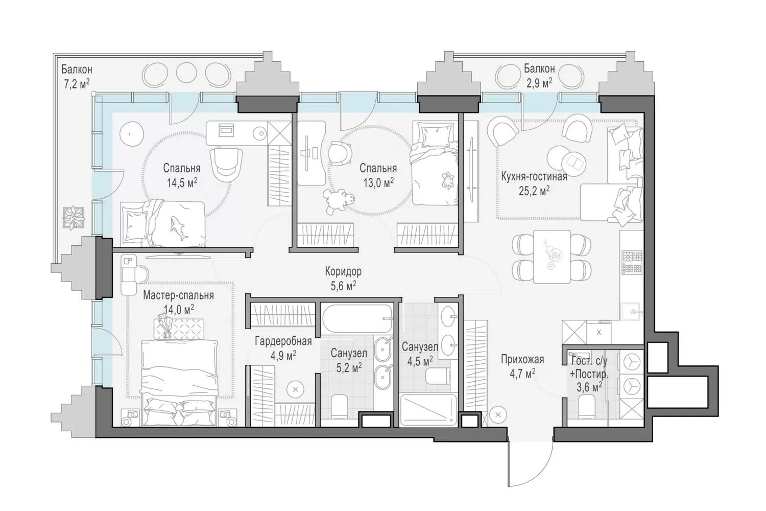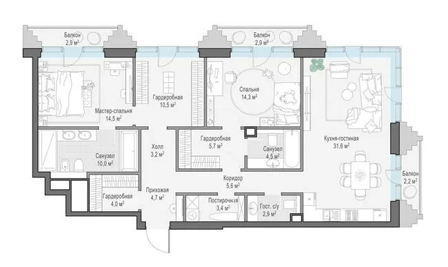 124.7 м² · 3 комнаты · 2/14 этаж · Сентябрь 2027