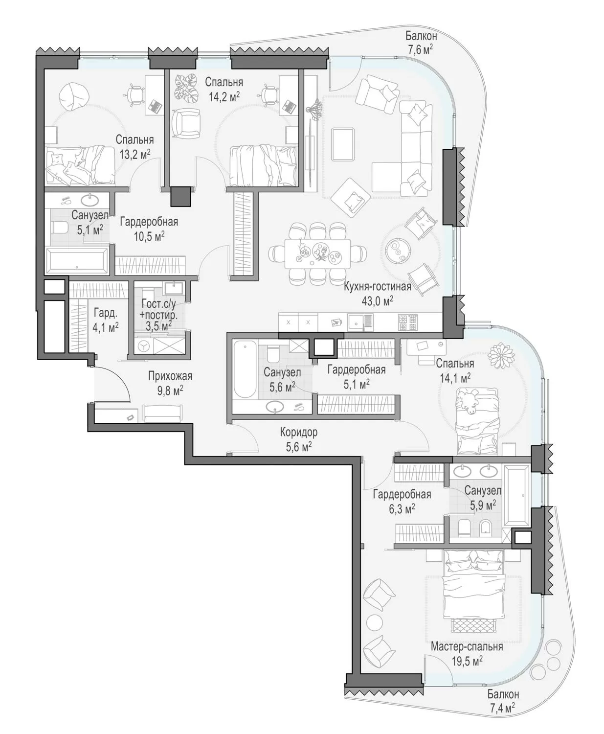 Продажа 5-комнатной квартиры № 1, 286.2 кв.м, этаж 9/10 в Клубный квартал «Фрунзенская набережная»