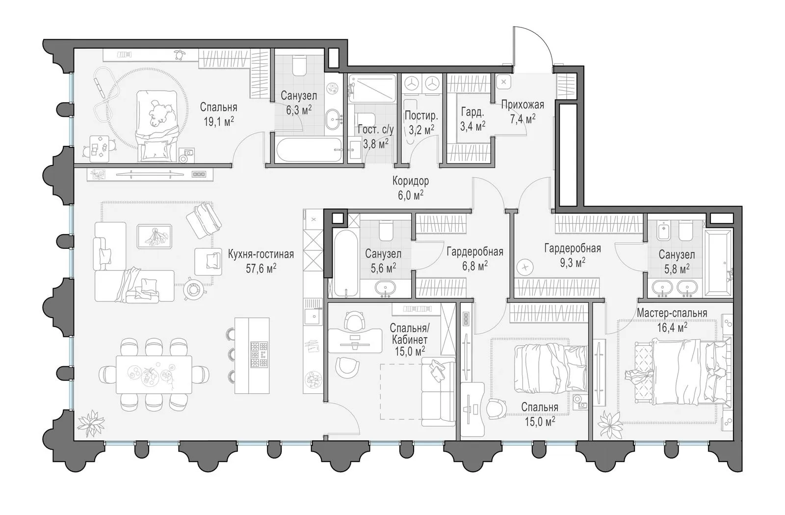 Продажа 4-комнатной квартиры № 1, 180.1 кв.м, этаж 9/13 в Клубный квартал «Фрунзенская набережная»