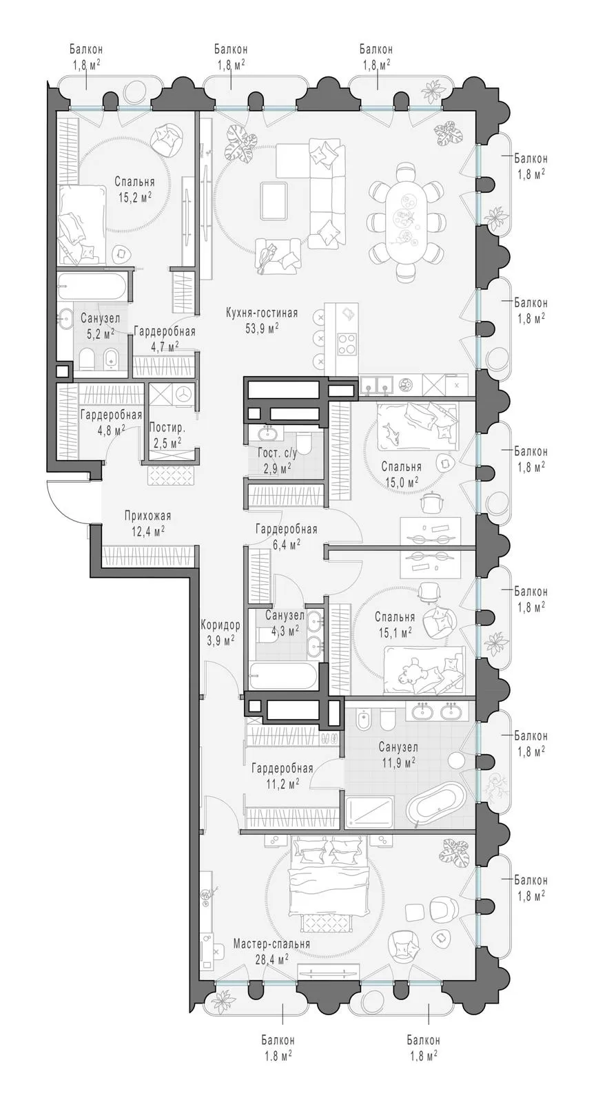 184.3 м² · 4 комнаты · 8/13 этаж · Сентябрь 2027