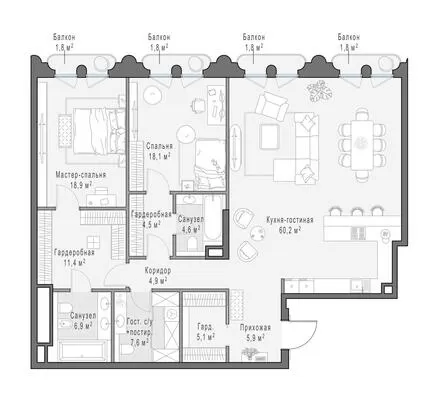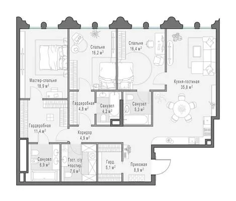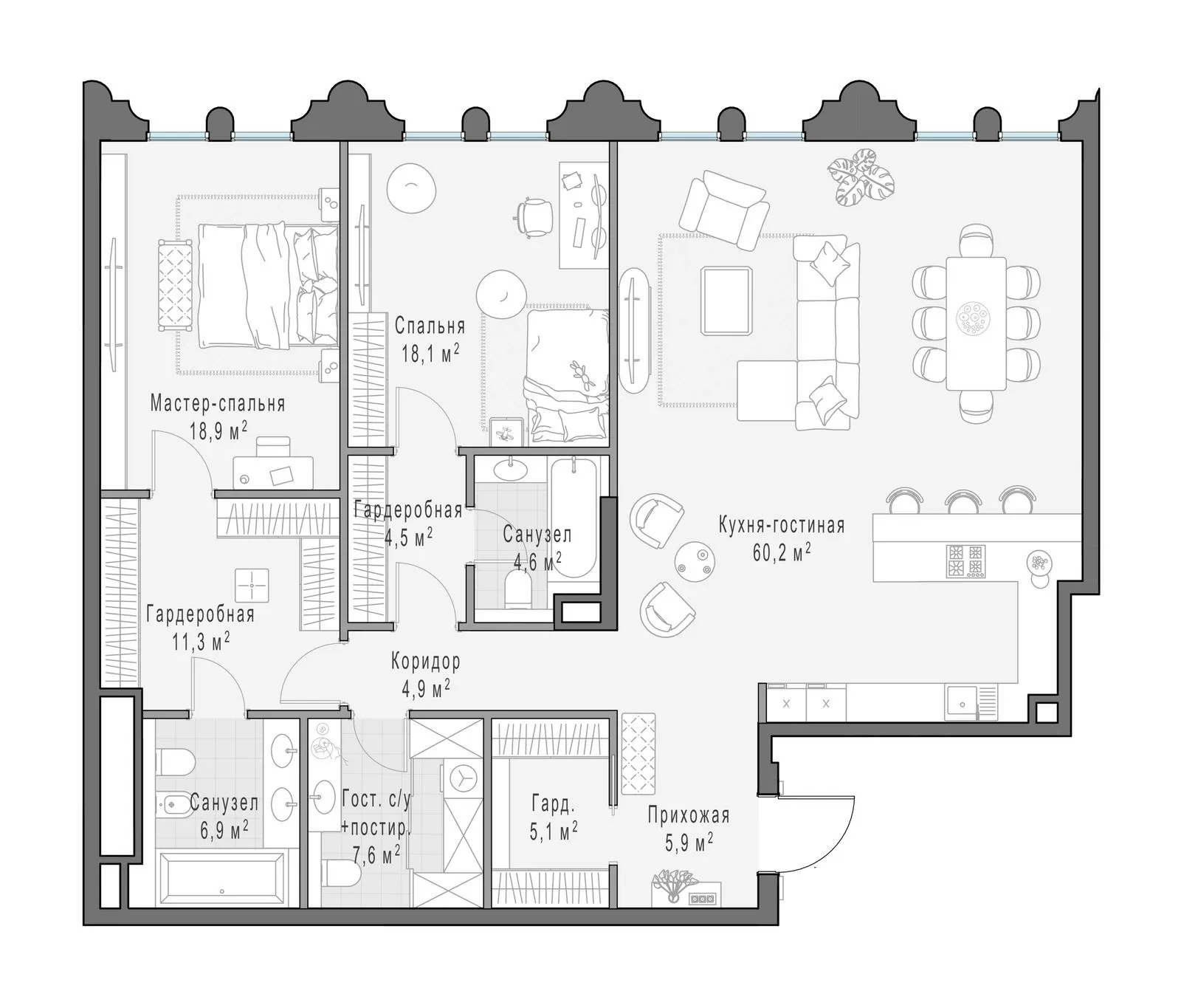 Продажа 3-комнатной квартиры № 2, 145.6 кв.м, этаж 5/13 в Клубный квартал «Фрунзенская набережная»