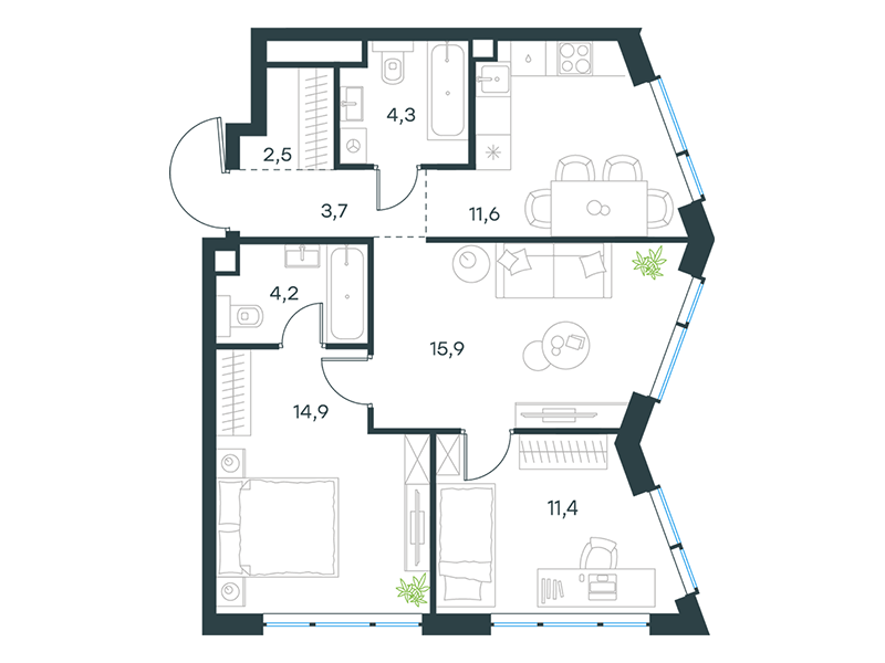 | 11 | Сентябрь 2027 | 2 | 19 | 5 | 5 | 2 | 43.4 | 23 827 114 | с отделкой | ![]() | 5 | ||