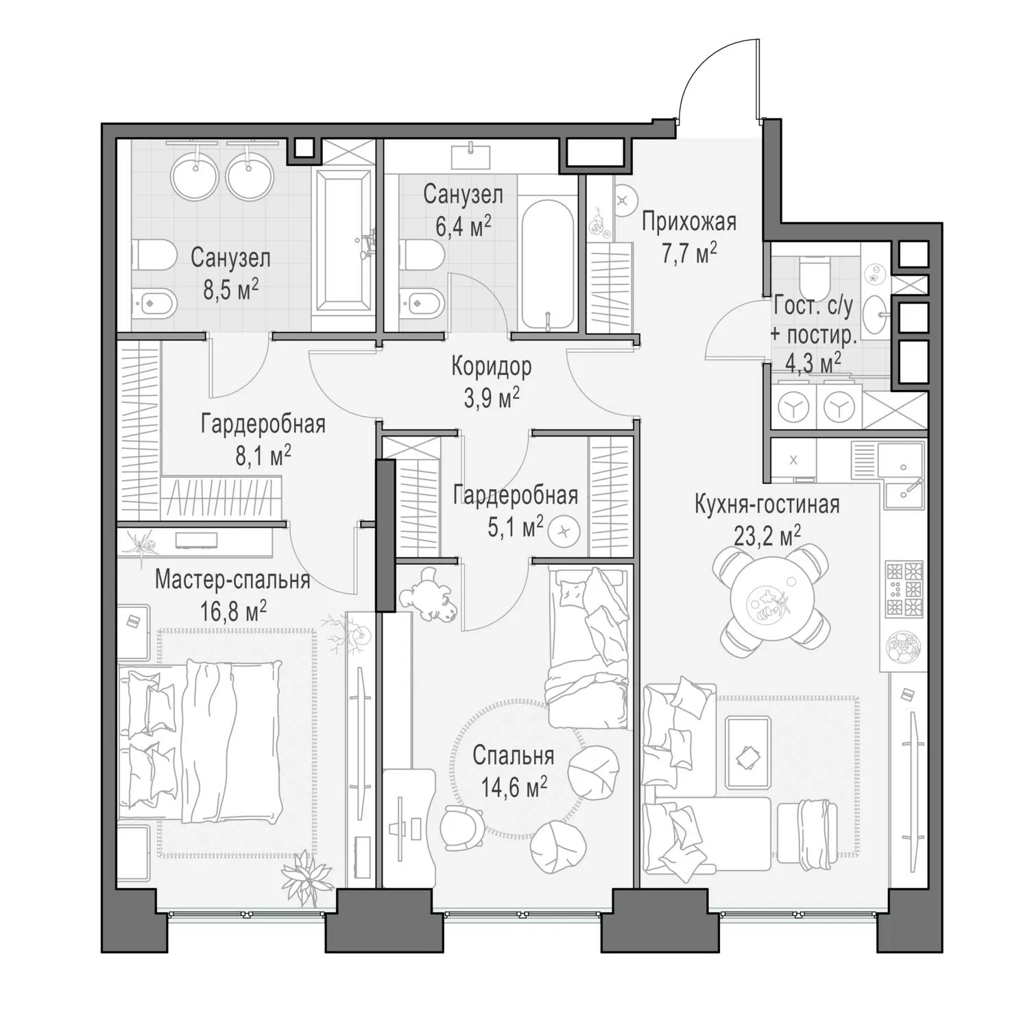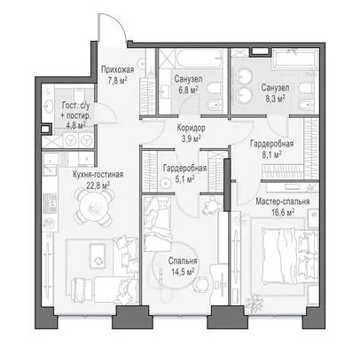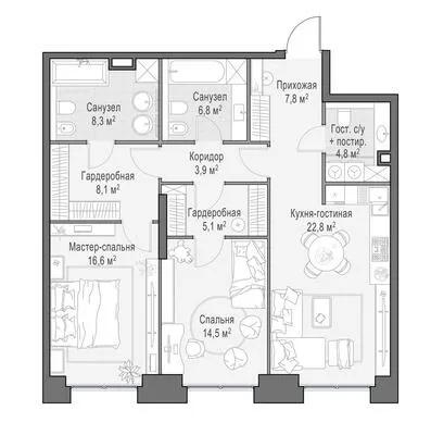 99.5 м² · 3 комнаты · 8/23 этаж · Июнь 2026