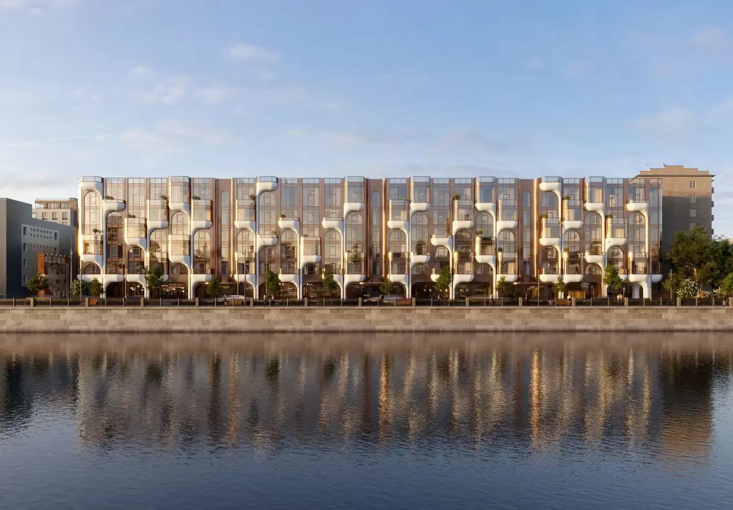 Архитектура резиденции «Саввинская 27» создана нью-йоркским бюро ODA, известным своими инновационными и скульптурными проектами. Архитекторам удалось создать яркий и лаконичный дизайн, где главными элементами стали уникальная ритмика балконов и эркеров, а также выразительный контраст стекла и меди на фасаде. Такой подход формирует динамичный, запоминающийся силуэт, который изящно отражается в водной глади реки.