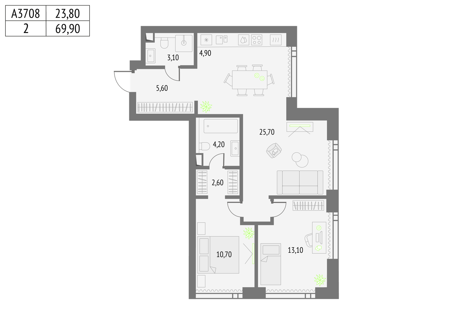 68.8 м² · 2 комнаты · 20/56 этаж · Сентябрь 2026
