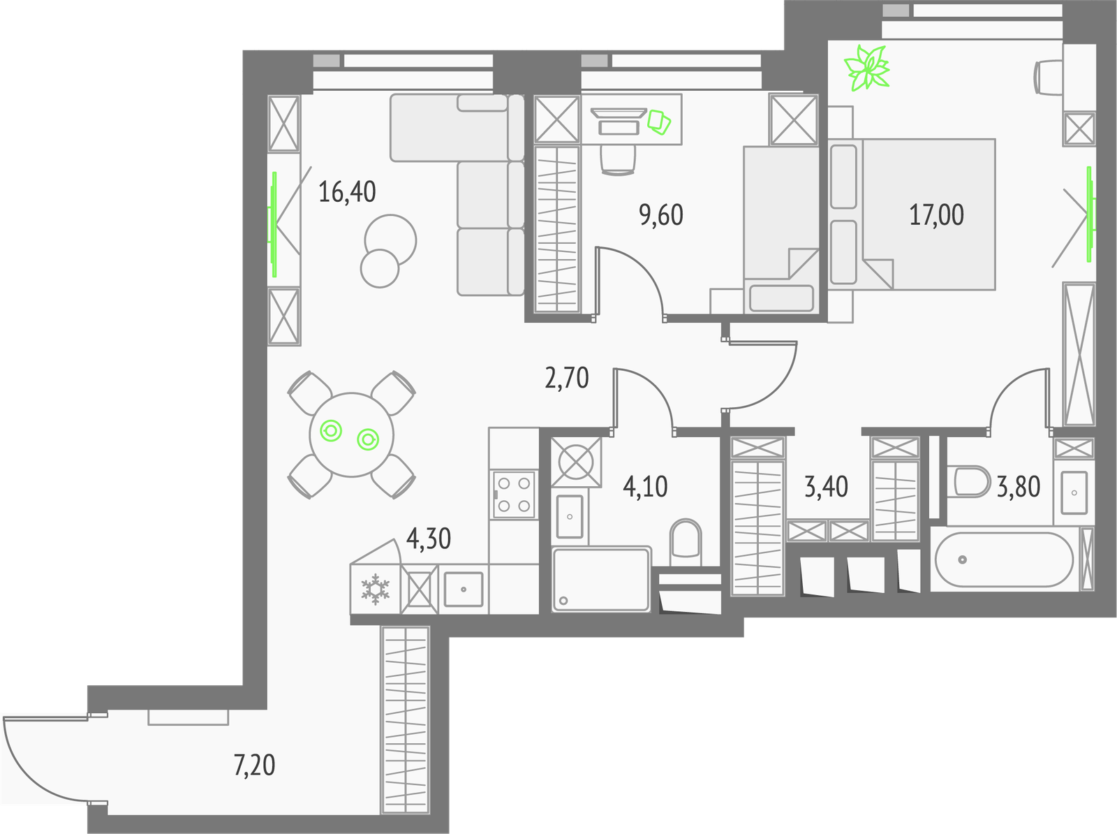62.8 м² · 2 комнаты · 4/56 этаж · Сентябрь 2026