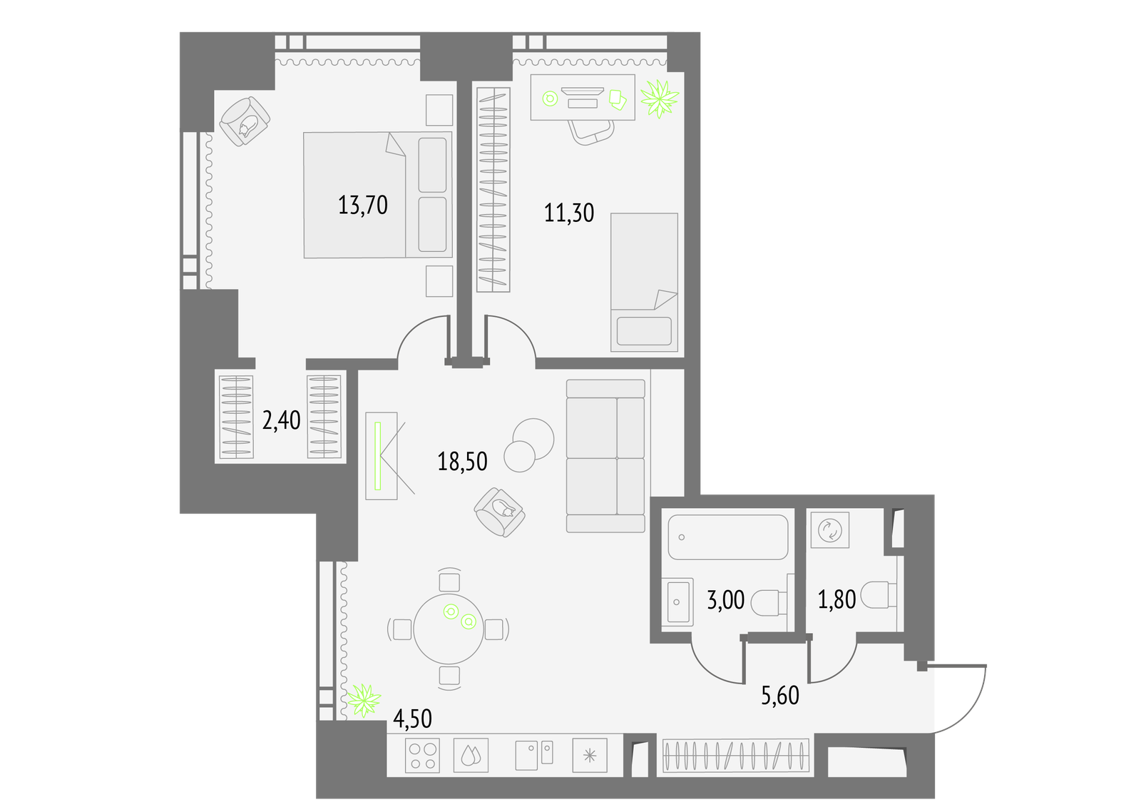62.8 м² · 2 комнаты · 4/56 этаж · Сентябрь 2026