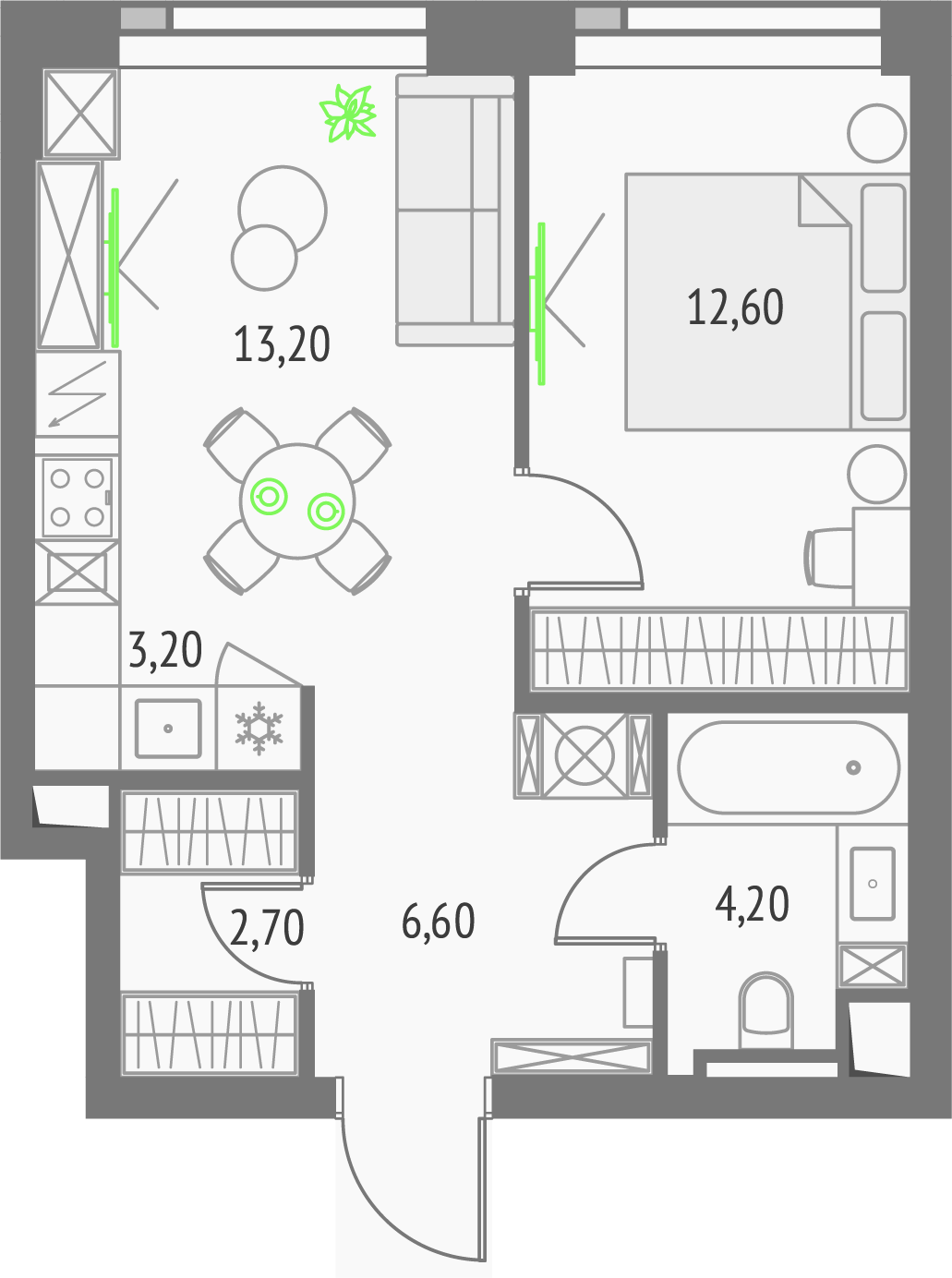 42.8 м² · 1 комната · 20/56 этаж · Сентябрь 2026