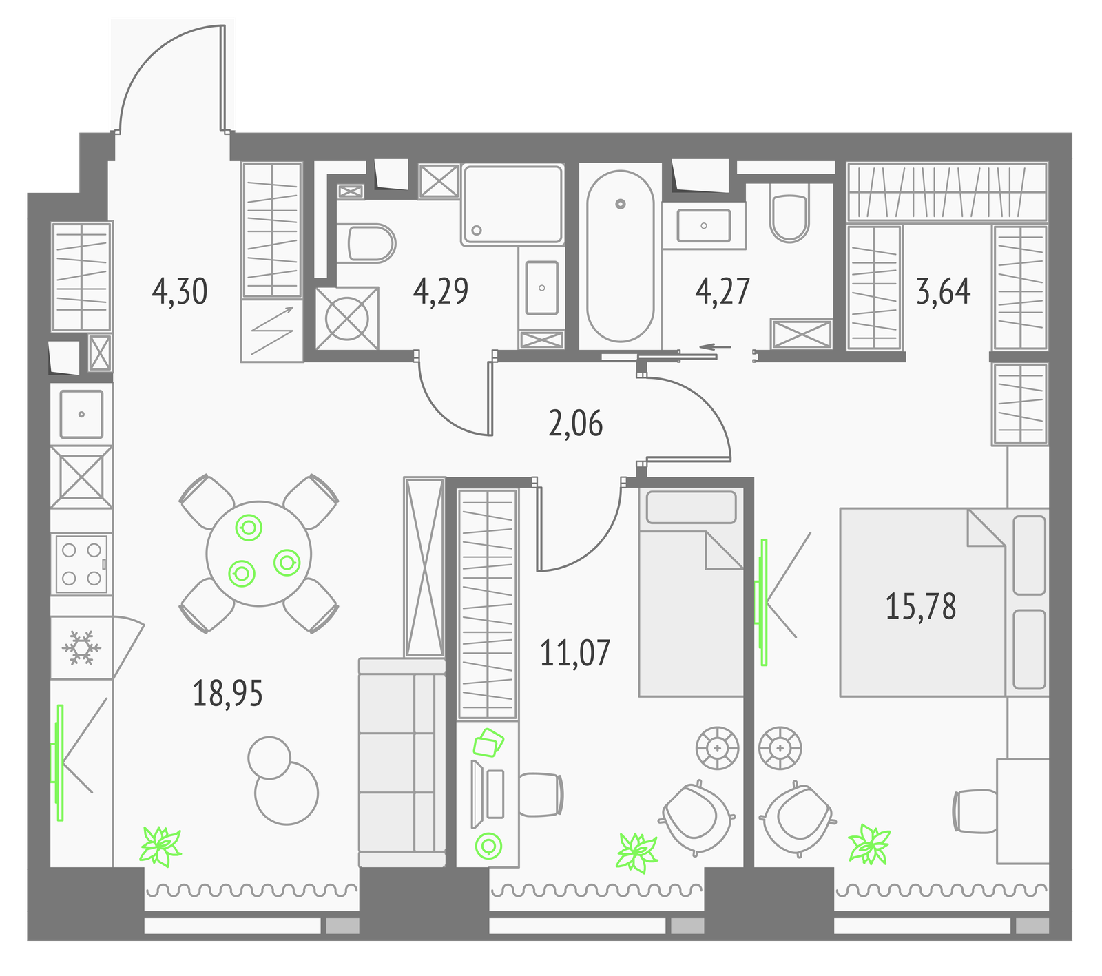 58.11 м² · 2 комнаты · 4/45 этаж · Июнь 2027