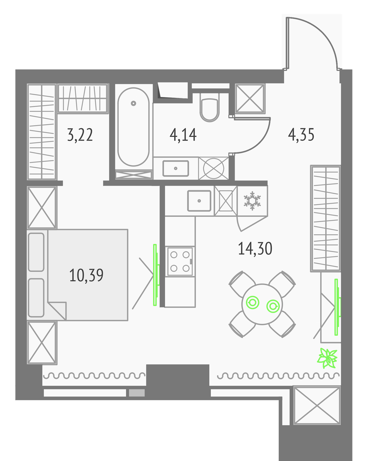35.47 м² · 1 комната · 22/45 этаж · Июнь 2027
