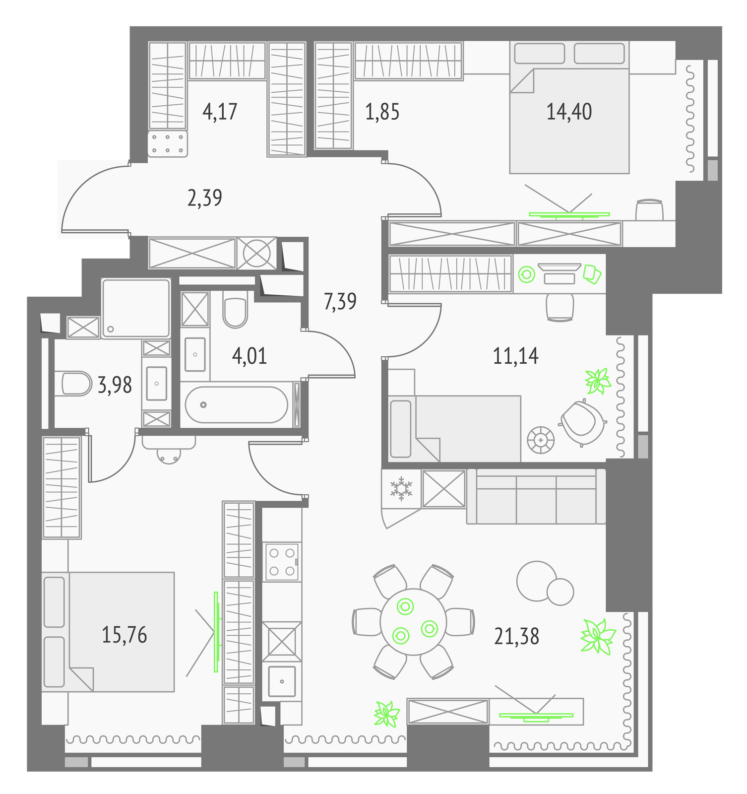 86.47 м² · 3 комнаты · 42/45 этаж · Июнь 2027