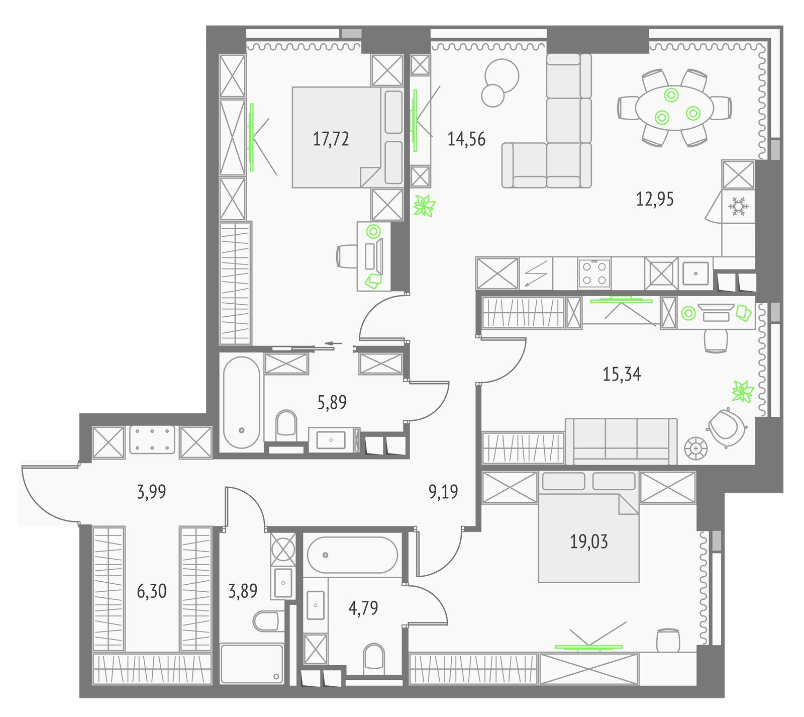113.65 м² · 3 комнаты · 3/19 этаж · Июнь 2027