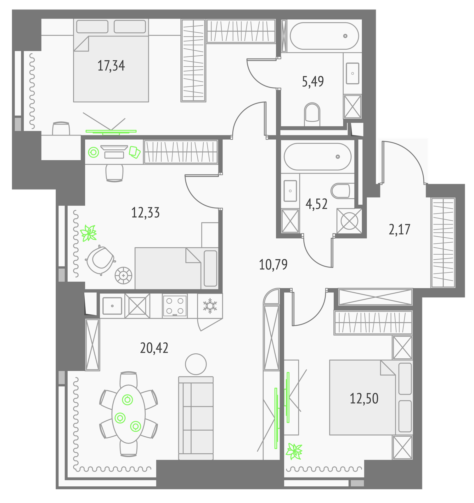 85.56 м² · 3 комнаты · 4/45 этаж · Июнь 2027