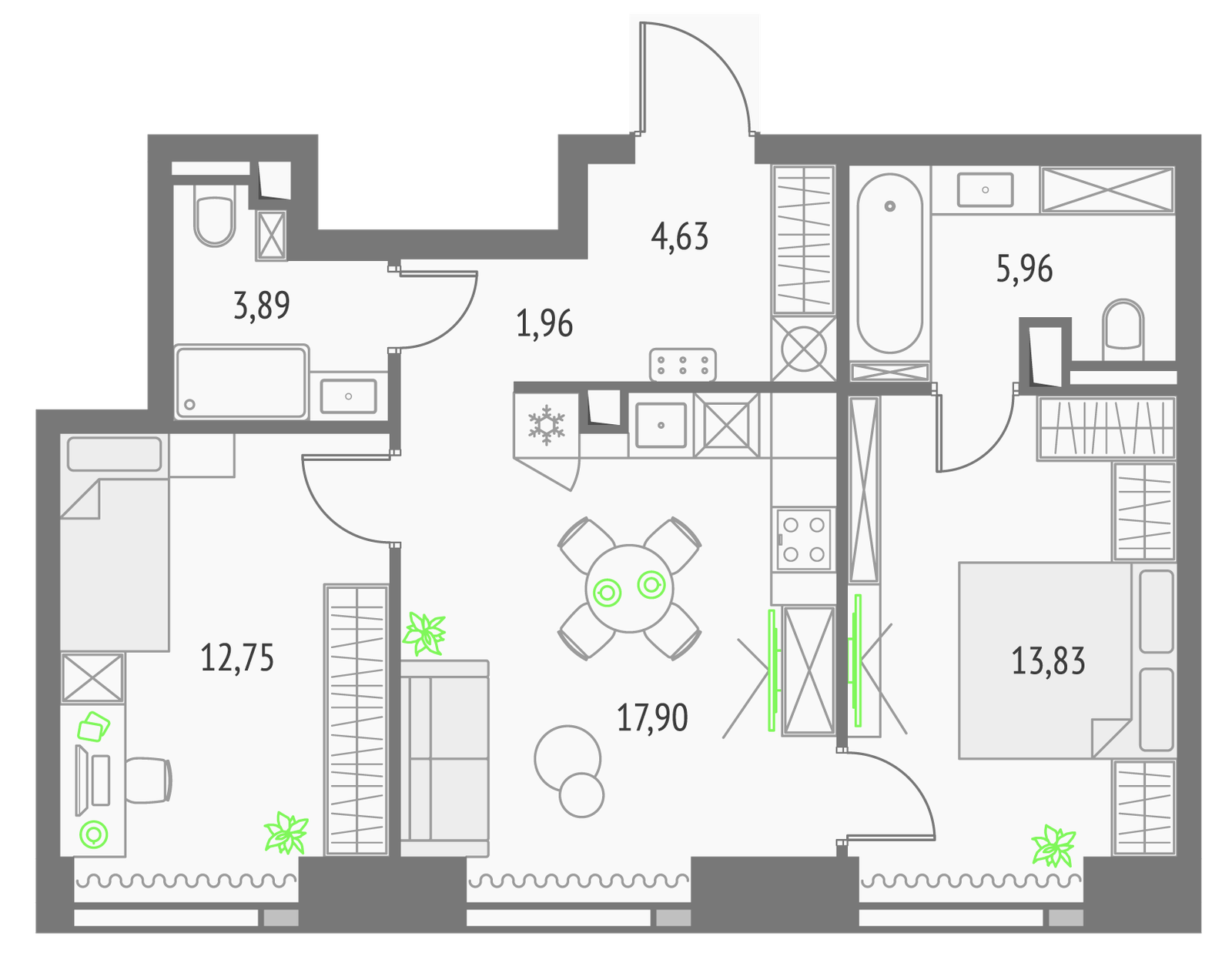 63.57 м² · 2 комнаты · 4/45 этаж · Июнь 2027