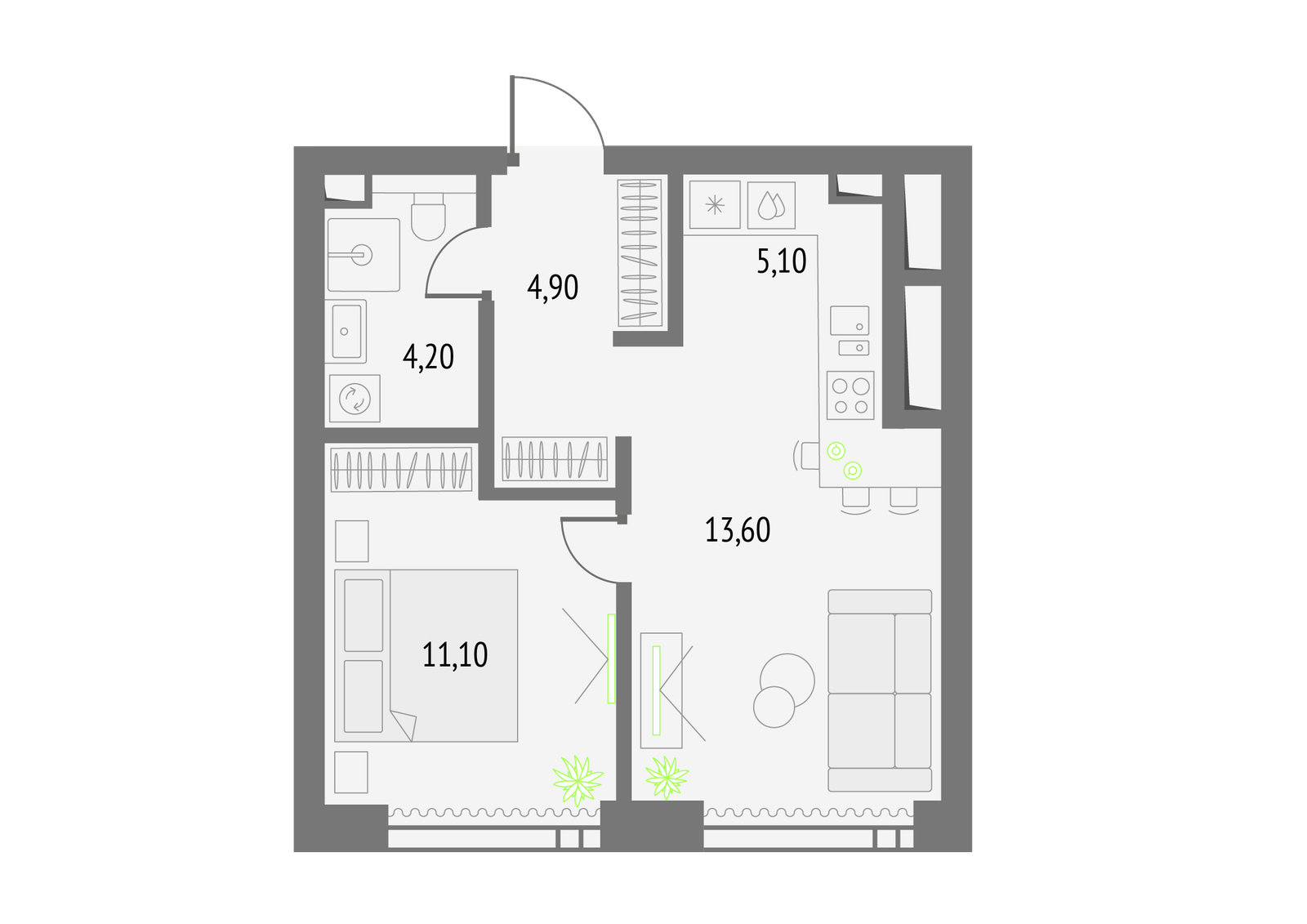 42 м² · 1 комната · 40/56 этаж · Сентябрь 2026