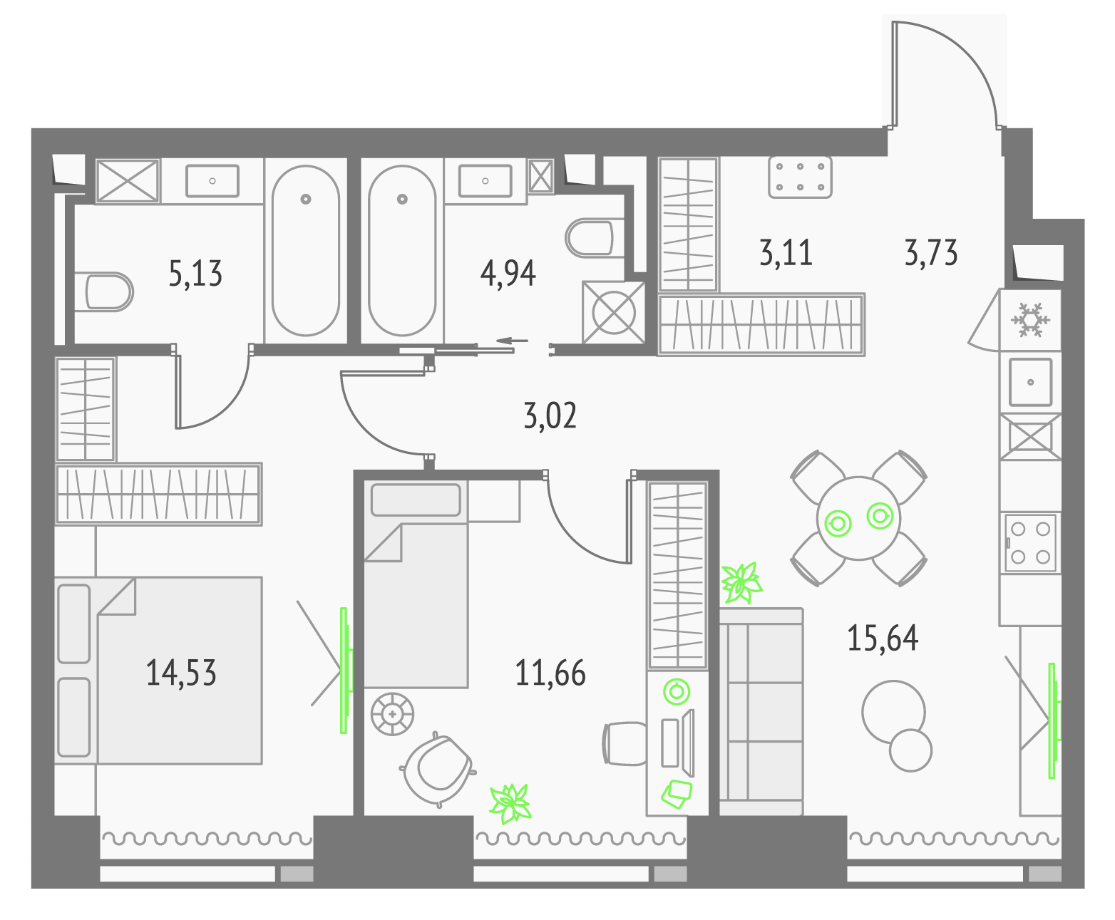 58.13 м² · 2 комнаты · 3/45 этаж · Июнь 2027
