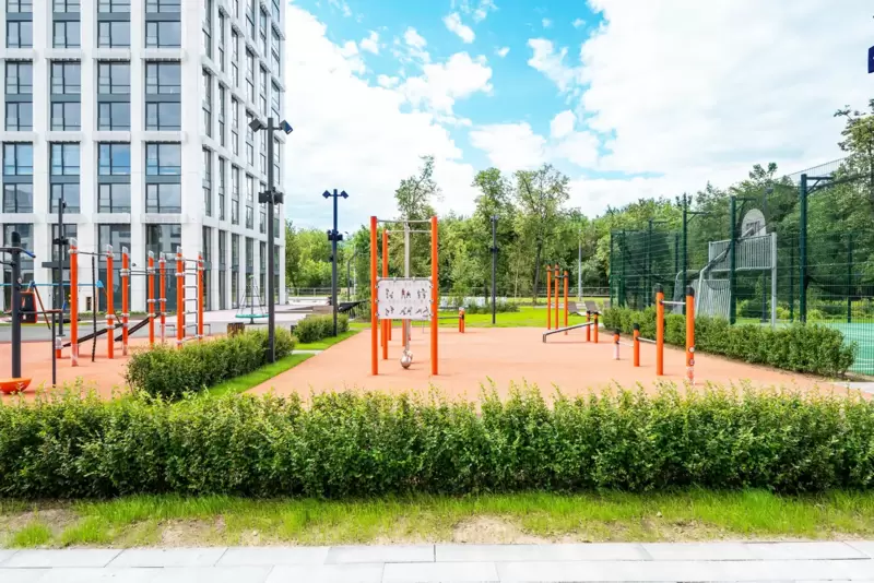 Территория зонирована с учетом активностей всех возрастов: уединенные лавочки в тени деревьев, оборудованы зоны с шезлонгами и декоративными фонтанами, современные и безопасные игровые площадки с качелями, каруселями и комплексами для развития, воркаут-зоны, площадки для командных игр и прямой доступ к спортивному комплексу, открытые площадки с навесами для встреч и пикников.