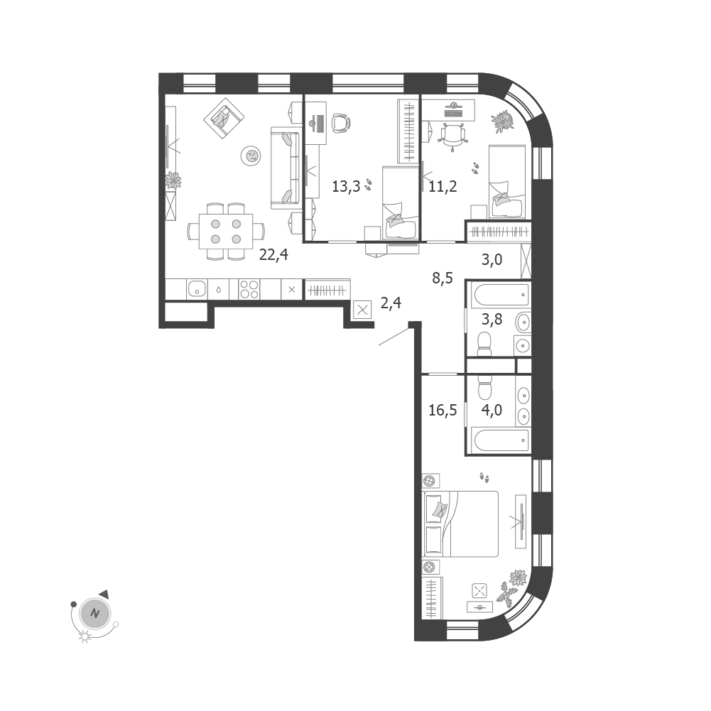 | 8 (III очередь, 5 этап) | Декабрь 2026 | 1 | 13 | 3 | 3 | 4 | 116.5 | 61 919 343 | без отделки | ![]() | 3 | ||