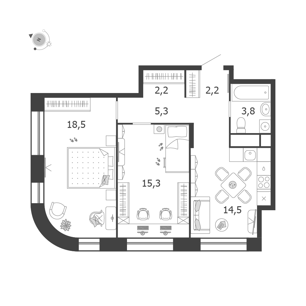 | 7 (III очередь, 3 этап) | Июнь 2028 | 1 | 18 | 2 | 2 | 2 | 53.4 | 33 806 768 | без отделки | ![]() | 2 | ||