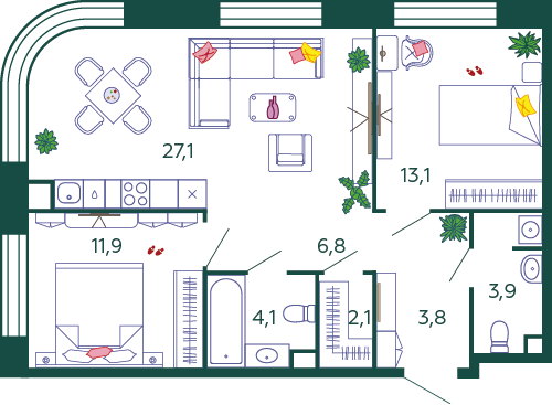 | 11 (III очередь, 3 этап) | Июнь 2028 | 2 | 5 | 1 | 1 | 3 | 66.9 | 36 957 272 | без отделки | ![]() | 1 | ||