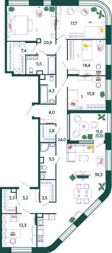 | 7 (III очередь, 3 этап) | Июнь 2028 | 1 | 2 | 5 | 5 | 1 | 37.3 | 22 107 278 | без отделки | ![]() | 5 | ||