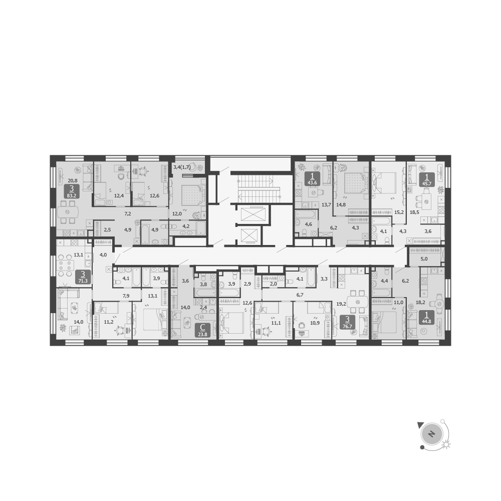 | 8 (III очередь, 5 этап) | Декабрь 2026 | 1 | 4 | 3 | 3 | 1 | 44.8 | 28 668 992 | без отделки | ![]() | 3 | ||