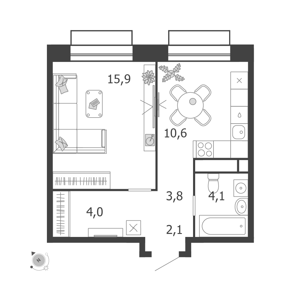 | 4 (III очередь, 2 этап) | Июнь 2028 | 1 | 2 | 2 | 2 | 1 | 42.4 | 25 885 981 | без отделки | ![]() | 2 | ||