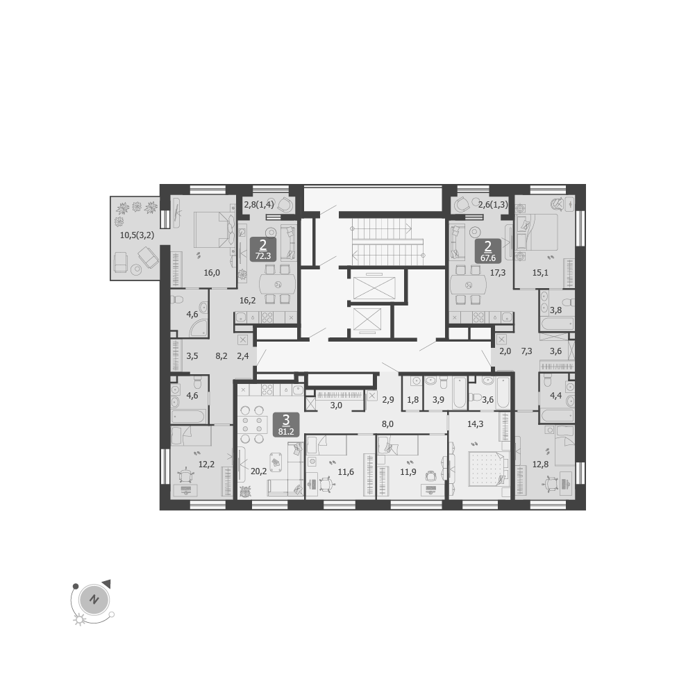 | 10 (III очередь, 3 этап) | Июнь 2028 | 1 | 3 | 1 | 1 | 3 | 85.1 | 46 199 632 | без отделки | ![]() | 1 | ||