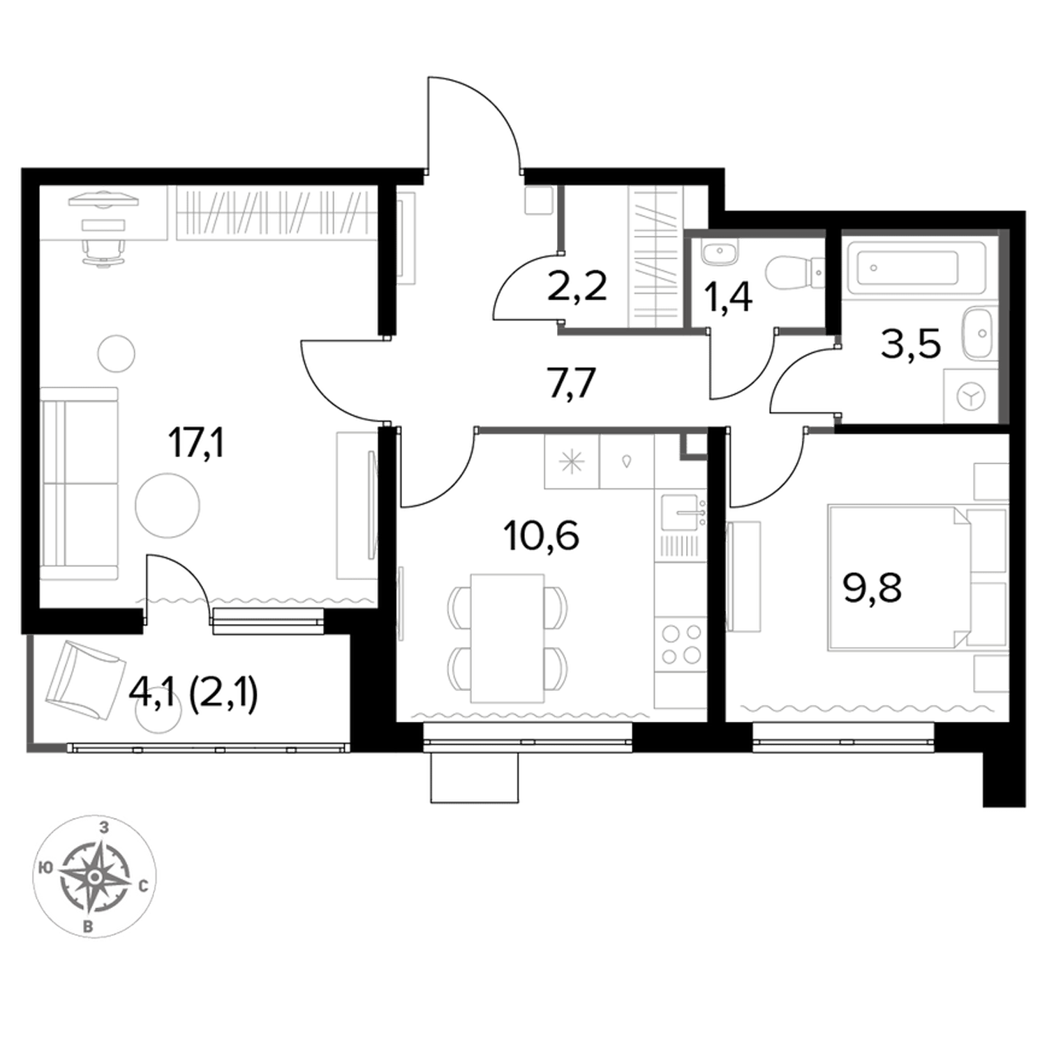 Продажа 2-комнатной квартиры № 1, 54.7 кв.м, этаж 21/24 в ЖК «1-й Лермонтовский»