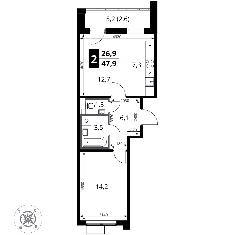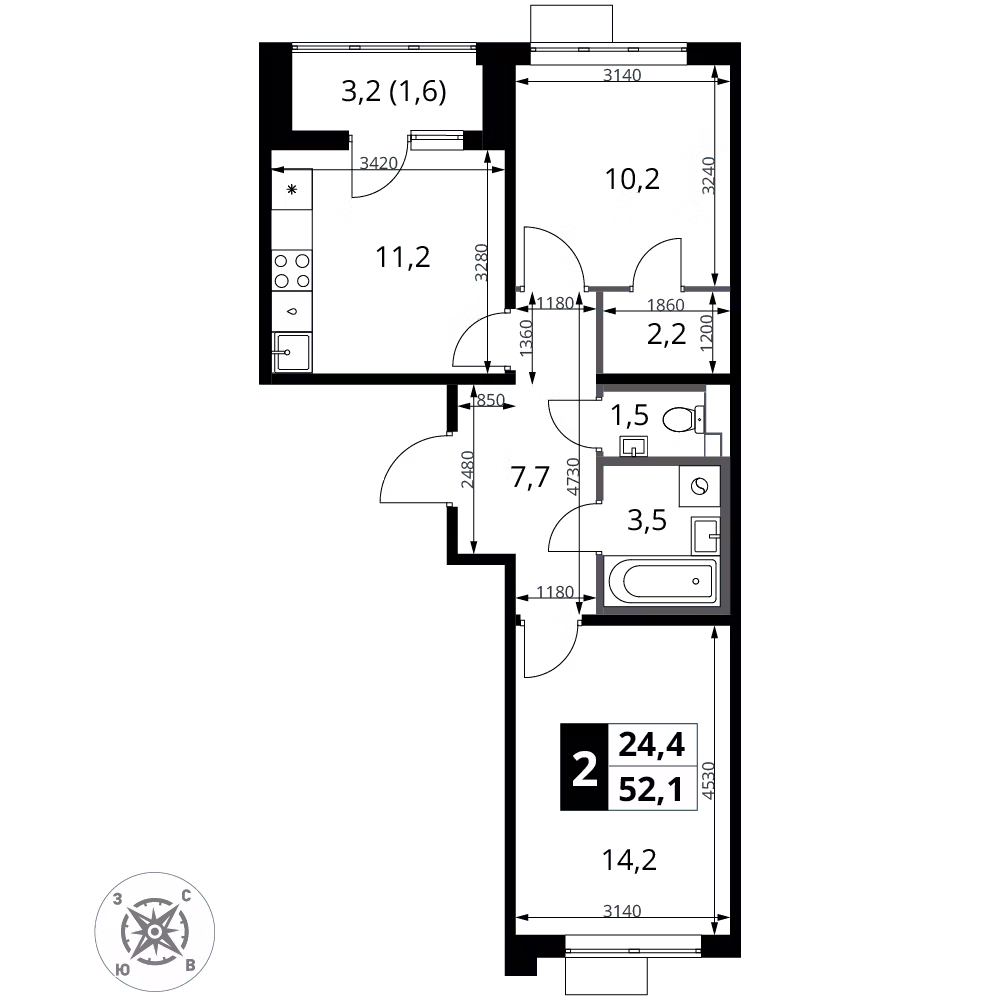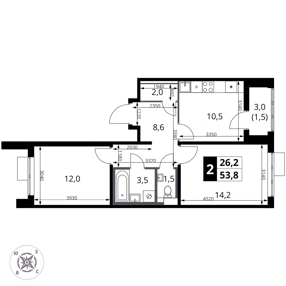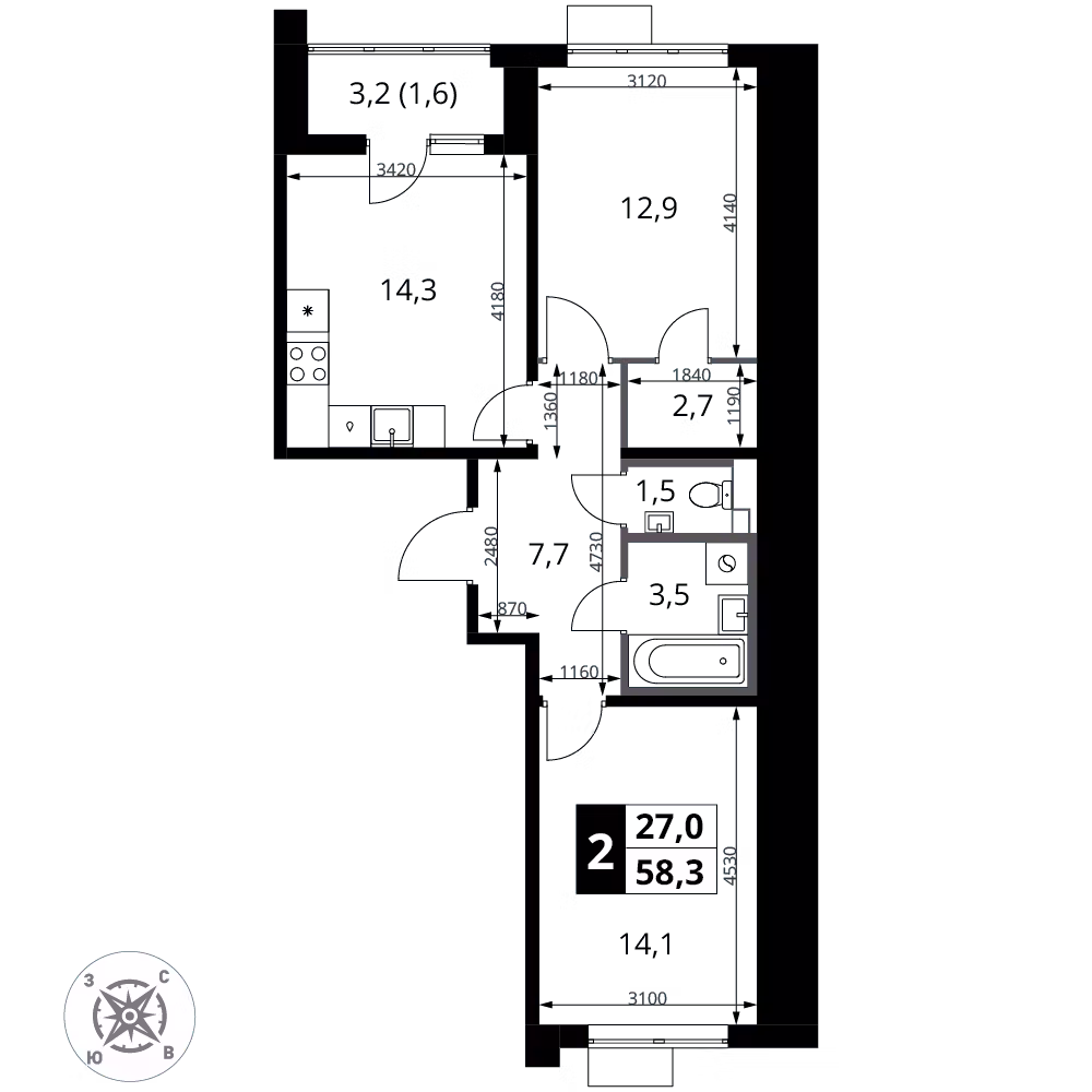 | 3 | Март 2027 | 14 | 7 | 2 | 2 | 1 | 19.3 | 7 779 830 | без отделки | ![]() | 2 | ||
