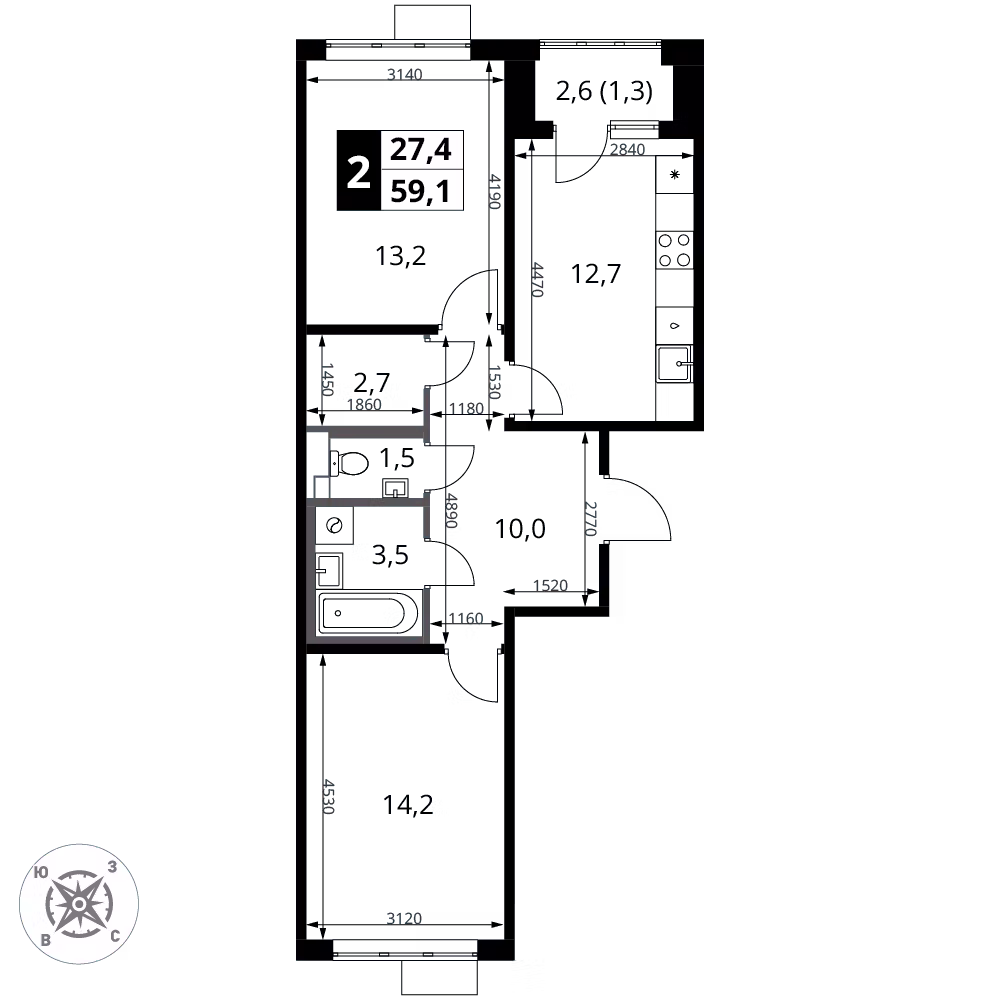 | 3 | Март 2027 | 13 | 4 | 1 | 1 | 2 | 58.1 | 16 901 290 | без отделки | ![]() | 1 | ||