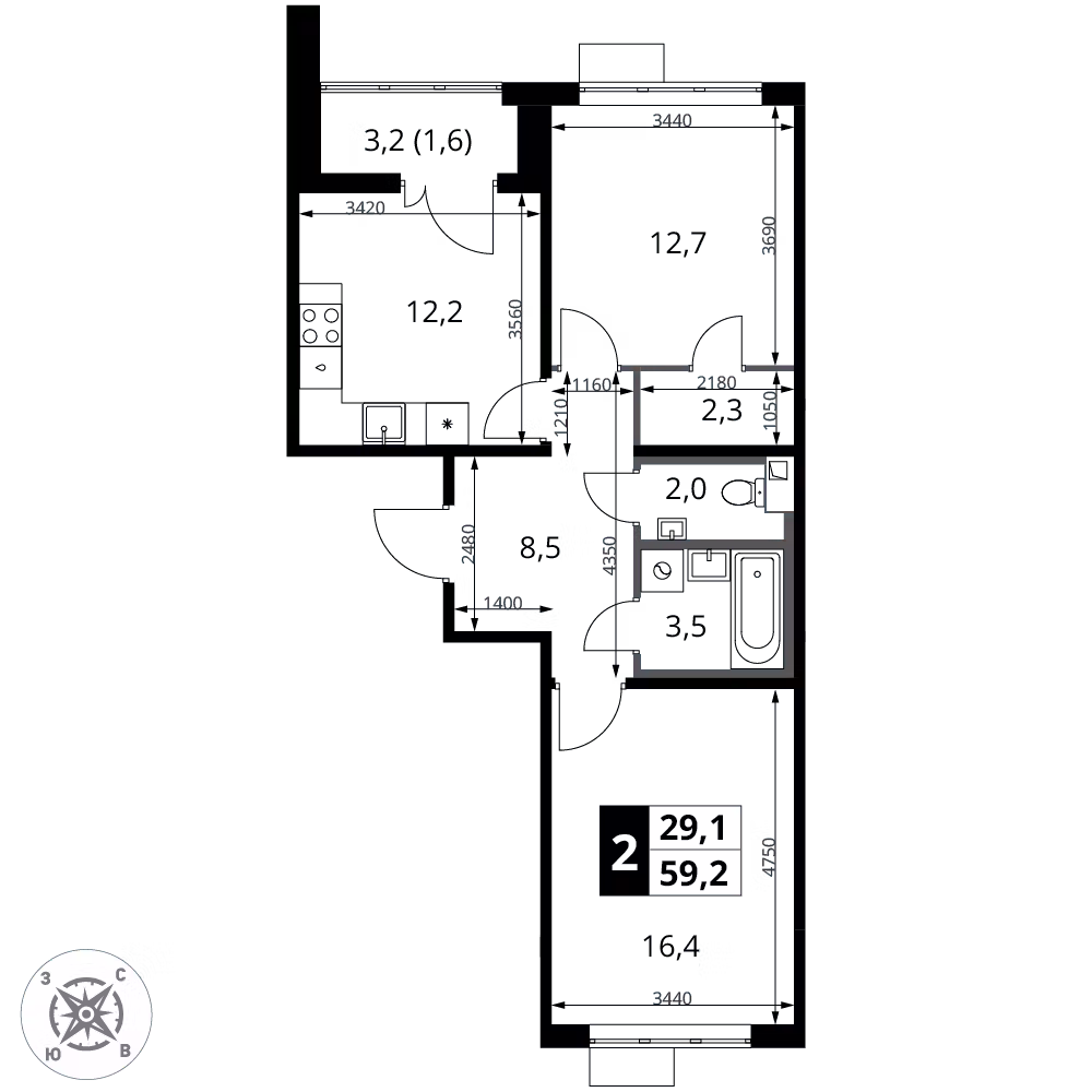 59.3 м² · 2 комнаты · 16/16 этаж · Март 2027