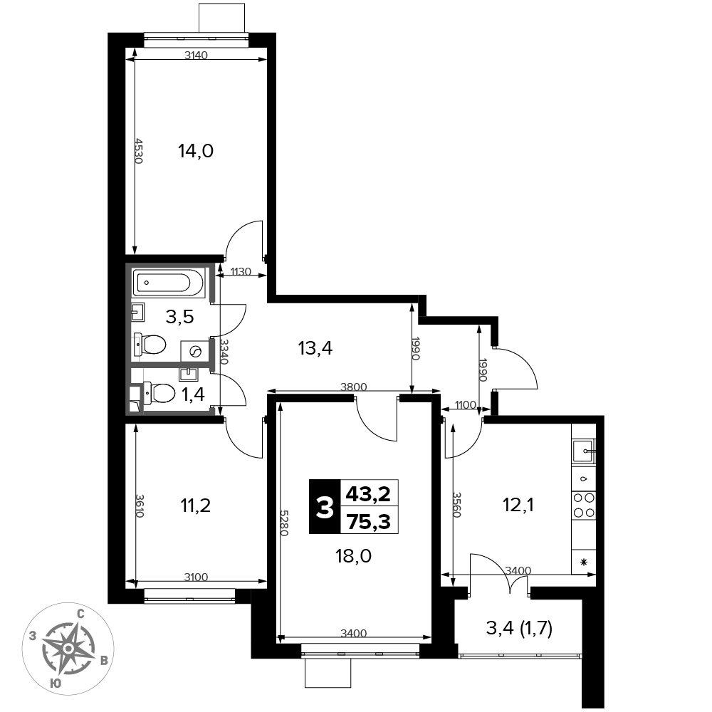 ГлавнаяЖилая недвижимостьЖК "1-й Донской"3-комнатная квартира № 1