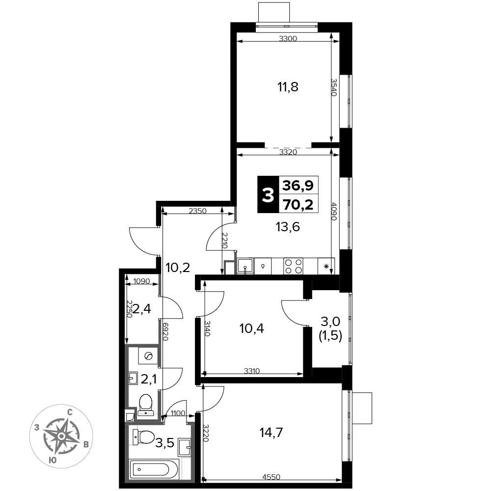 70.2 м² · 3 комнаты · 14/24 этаж · Апрель 2025