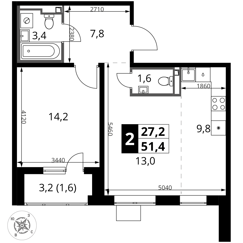 ГлавнаяЖилая недвижимостьЖК "1-й Донской"2-комнатная квартира № 2