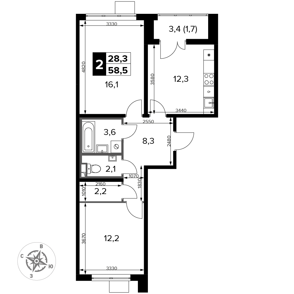 58.5 м² · 2 комнаты · 16/24 этаж · Апрель 2025