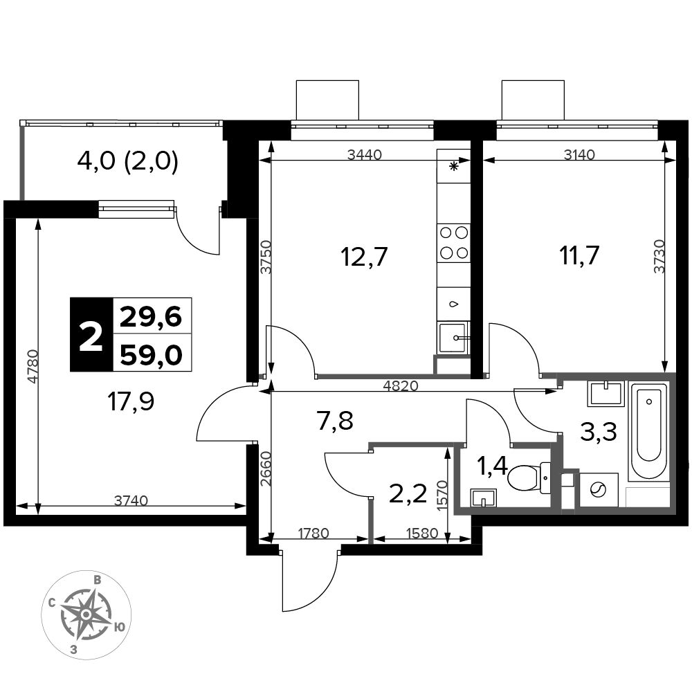 59 м² · 2 комнаты · 23/24 этаж · Апрель 2025