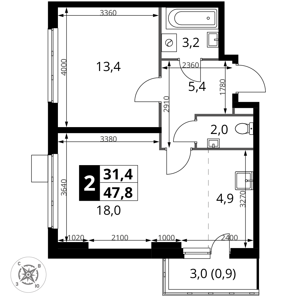 47.8 м² · 2 комнаты · 9/24 этаж · Март 2027
