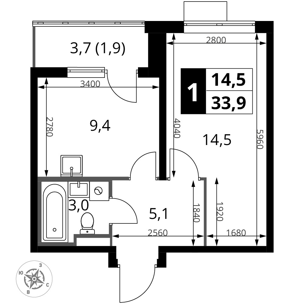 Продажа 1-комнатной квартиры № 9, 33.9 кв.м, этаж 3/24 в ЖК "1-й Донской"