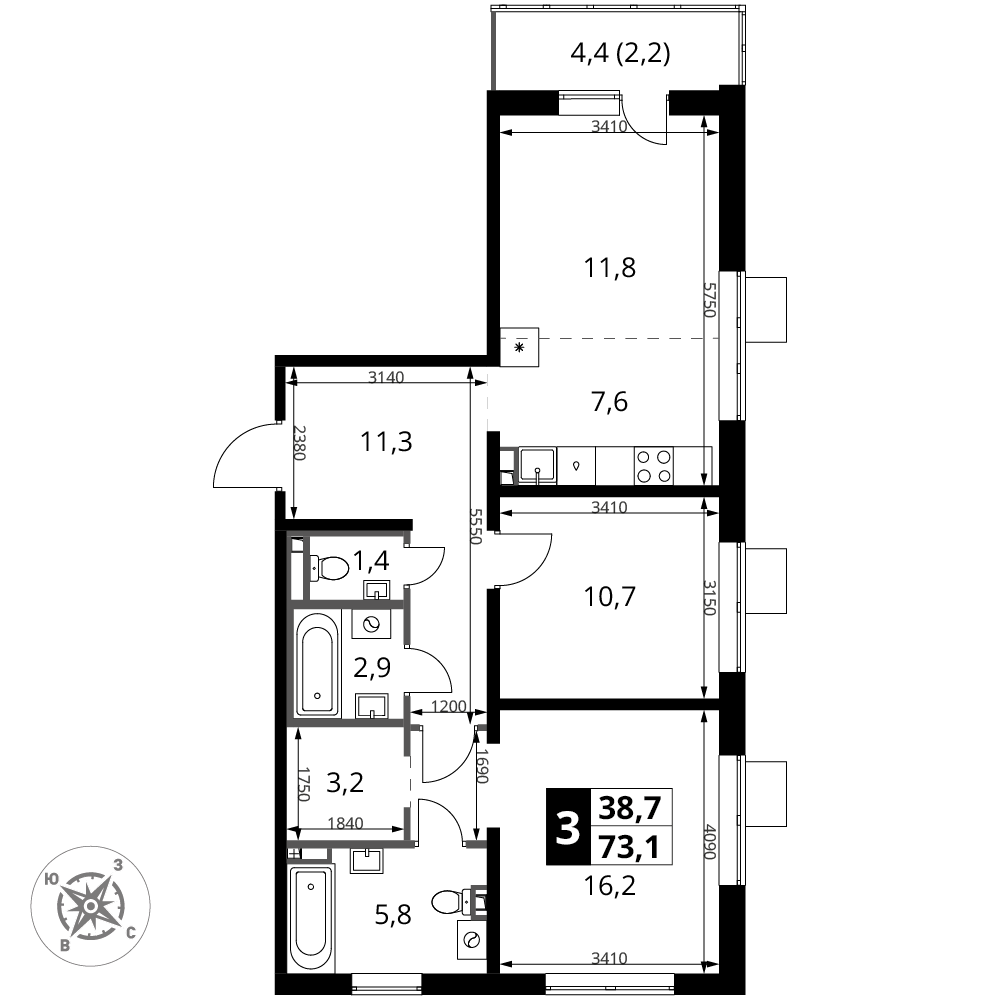 73.1 м² · 3 комнаты · 16/24 этаж · Декабрь 2026