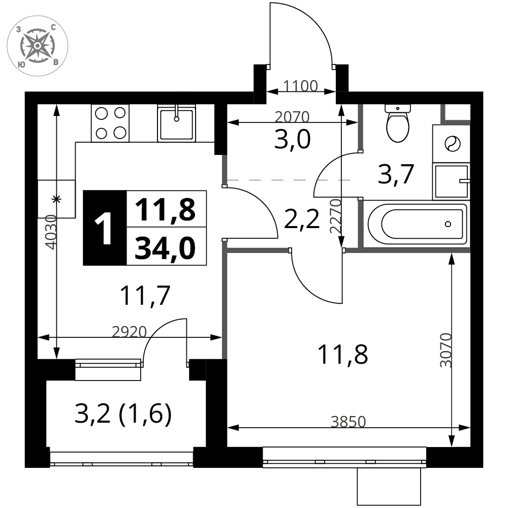 34.5 м² · 1 комната · 2/17 этаж · Март 2027