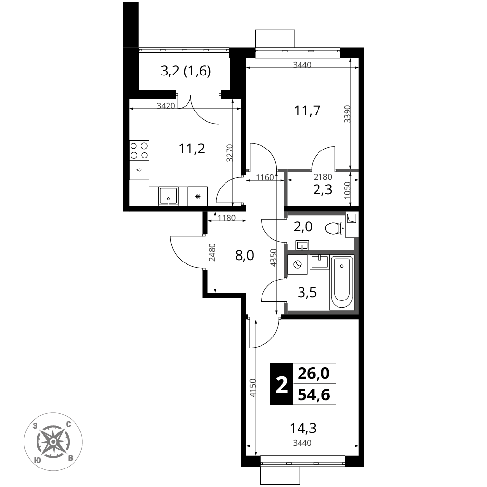 Продажа 2-комнатной квартиры № 1, 54.6 кв.м, этаж 13/16 в ЖК "1-й Шереметьевский"