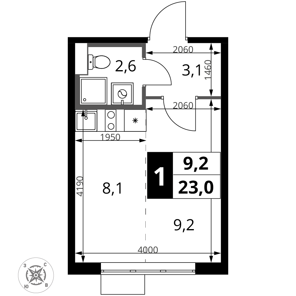 23 м² · 1 комната · 4/16 этаж · Декабрь 2028