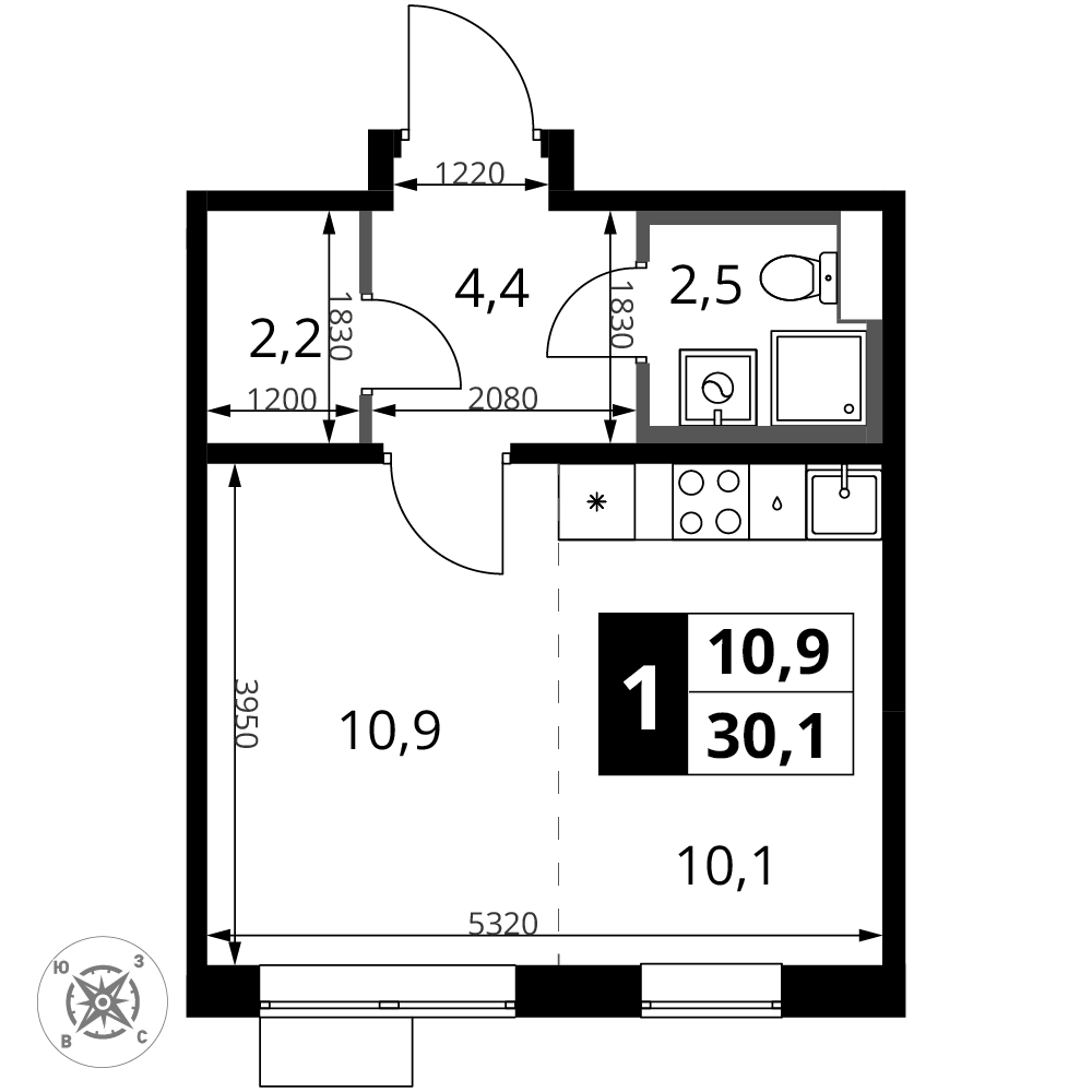 30.1 м² · 1 комната · 13/16 этаж · Декабрь 2028