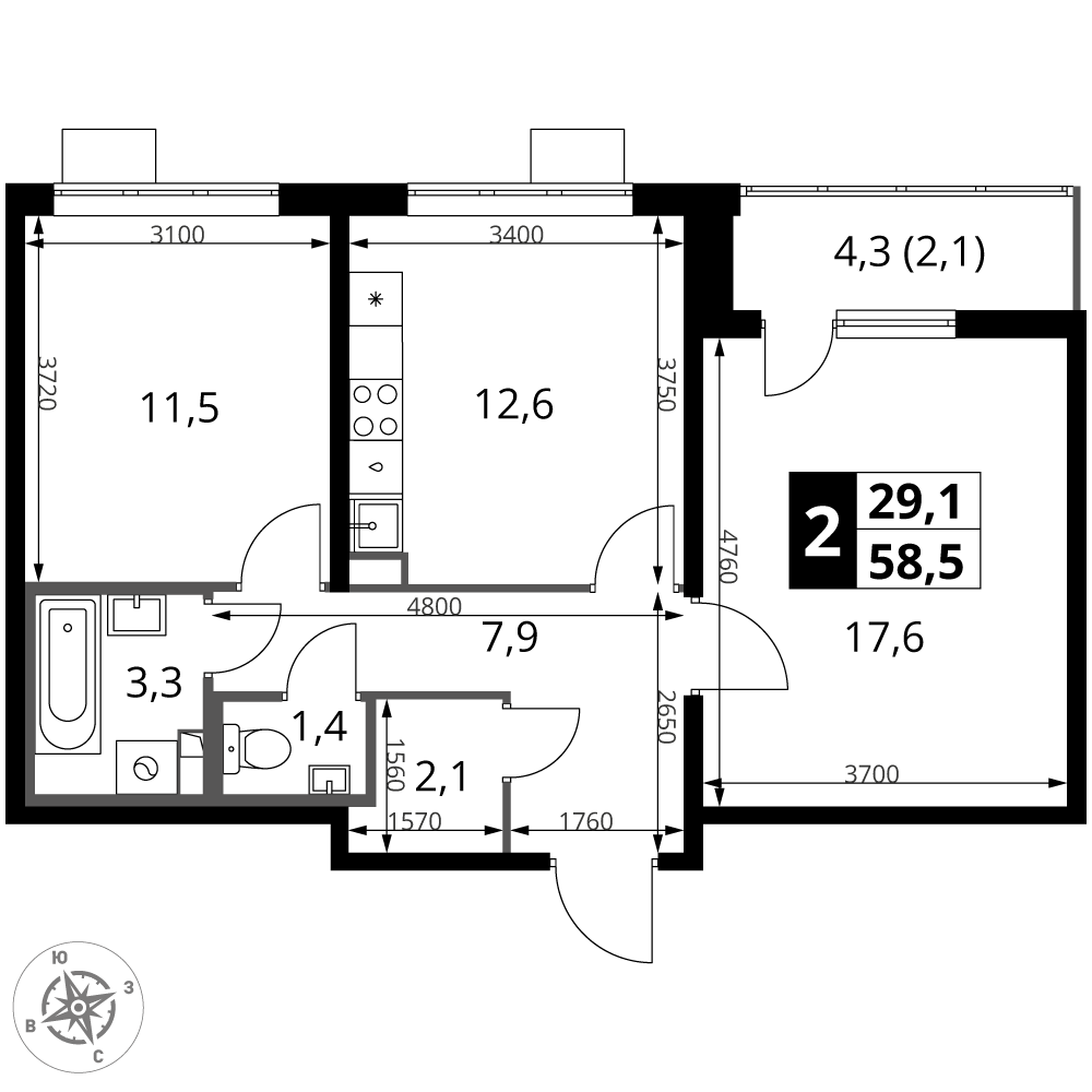 ГлавнаяЖилая недвижимостьЖК "1-й Южный"2-комнатная квартира № 4