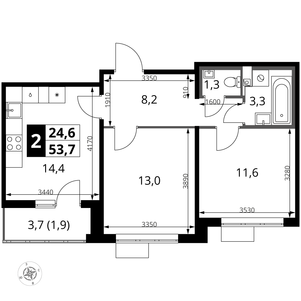 53.6 м² · 2 комнаты · 13/24 этаж · Март 2027
